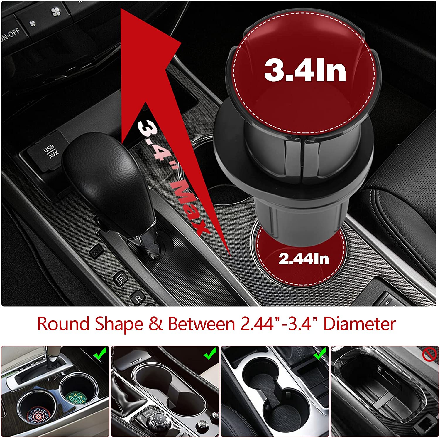 【Adjustable Cup Holder】The base diameter can be expanded from 2.5 inches to 4.33 inches to fill the console cup holder, which is suitable for different vehicles and compatible with SUVs, RVs, golf carts, treadmills, combined sofas, etc, and it can also be used in the back row cup holders. Super stable base with three protruding extension structures and non-slip silicone, forming a triangular locking structure without popping out. Fit varieties of shape cup holders, DON'T FIT square cup holders.