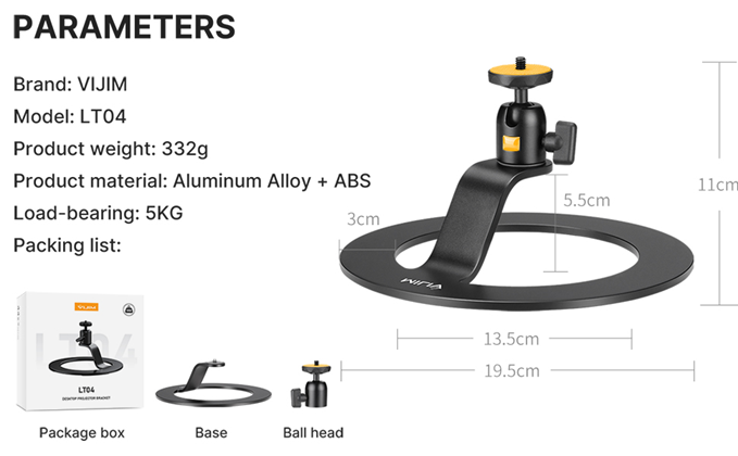 - The desktop projector stand base 19.5cm larger diameter, structural stability loading capacity 11.02 lb/5 kg is for projectors with 1/4in(6.35mm) Mounting Screw Thread.