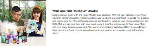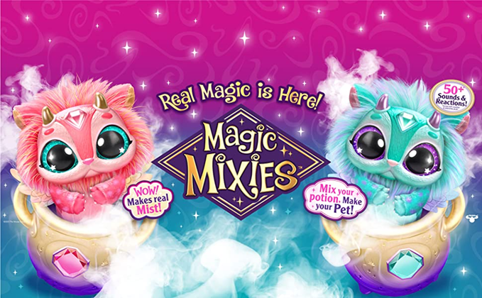 Experience Real Magic With The Magic Mixies Magic Cauldron. You Will Be Amazed When You See What Magically Appears From The Mist When You Finish Casting Your Spell! Who Will You Magically Create? Your Magic Mixies Magic Cauldron Comes With All The Magic Ingredients And A Special Wand For You To Mix A Potion And Make A Cute Furry Pet! First Read The Spell From Your Spell Book. Add The Magical Ingredients To Your Cauldron One Step At A Time. Each Ingredient Helps Your Creature Come To Life. As You Go Through Each Step Of The Spell And Tap The Cauldron With Your Wand, Your Cauldron Will React By Lighting Up And Making Different Sounds. Now Watch As Real Mist Begins To Rise From The Cauldron. Listen! Do You Hear Your Magic Mixie Coming To Life? Wow, You'Ve Just Created A Magical New Friend! So Adorable And So Interactive, Your Magic Mixie Reacts To You Touch And Responds To Your Wand. They Love To Perform Spells With You And May Even Grant You A Wish As Their Gem Lights Up! Magic Mixie Love Cuddles And Being Pet. The More You Nurture And Care For Them, The Stronger Their Energy Levels Become. Your Magic Mixie And Their Magic Cauldron Have Over 50 Sounds And Reactions! Place Your Magic Mixie Back Into The Cauldron And Repeat The Magical Reveal Again And Again. (Magic Mist & Spells Refill Pack Sold Separately) You Can Also Make Your Own Toys And Other Items Magically Appear From The Mist Using The Cauldron'S Magic Gem Case. Perform Spells And Misty Reveals And Amaze Your Friends! With Two Different Colored Magic Mixies To Choose From - Pink Or Blue, There Is So Much Enchantment In Store And Adorable Magical Friends To Adore!