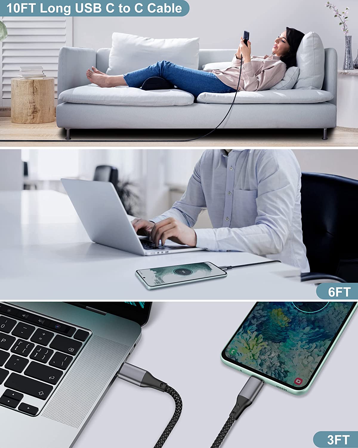 [Braided USB C to USB C Cable] Included 3FT 6FT 10FT multi length USB C charger cable easy for fast charging on different occasions, such as for travel, home, car, office, etc. Braided with durable nylon material, it has been tested to withstand at least 20000+ times bending.
