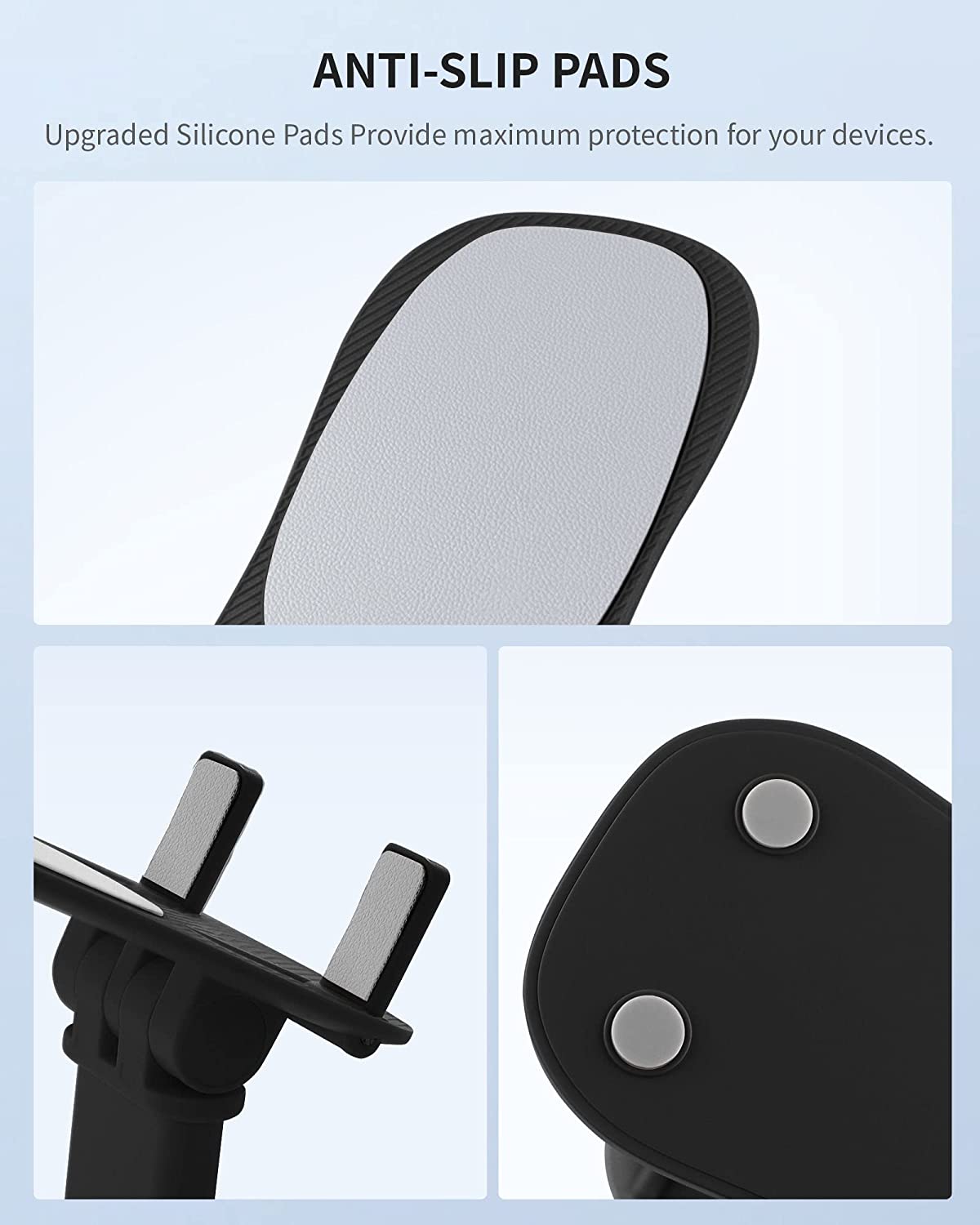 ANTI-SLIP PADS - The padded front surface and the hook of this cell phone stand are fully covered by anti-skid silicone. Compared with other phone stands, the silicone pads were upgraded and became larger. Providing maximum protection for your device from any scratches and slides.