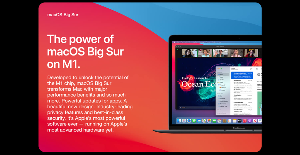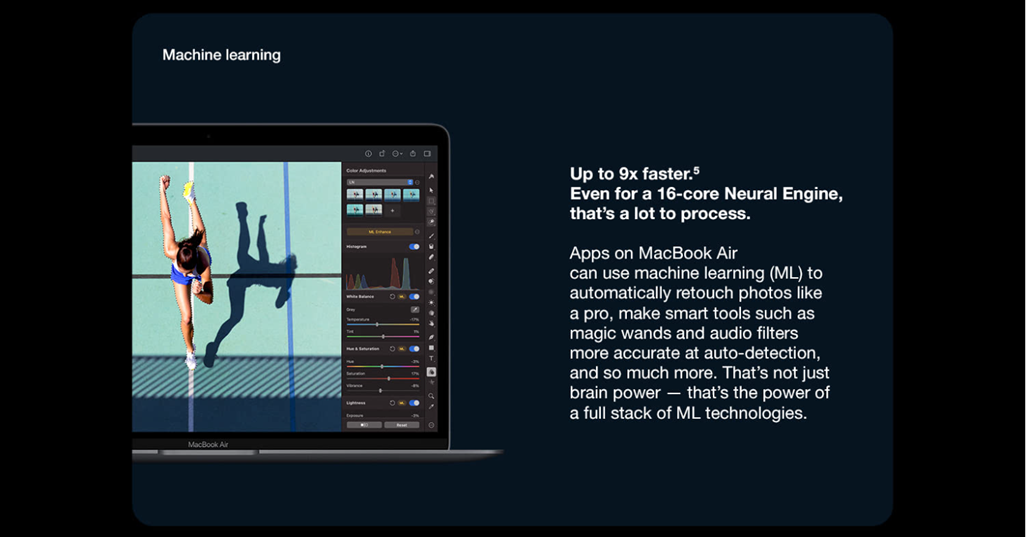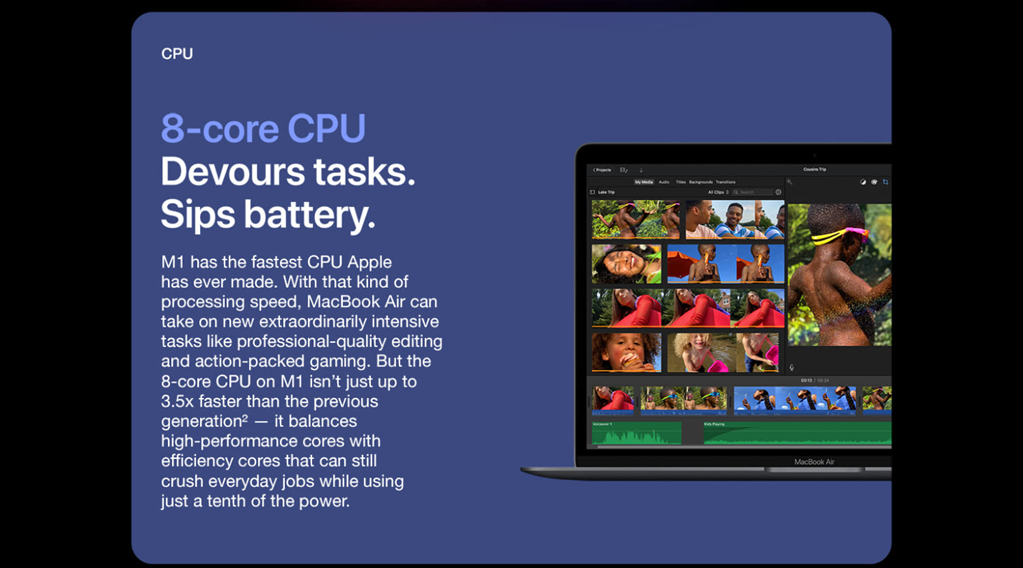 | Processor | System on Chip (SoC) Apple M1 chip; 8-core CPU with 4 performance cores and 4 efficiency cores; 16-core Neural Engine |