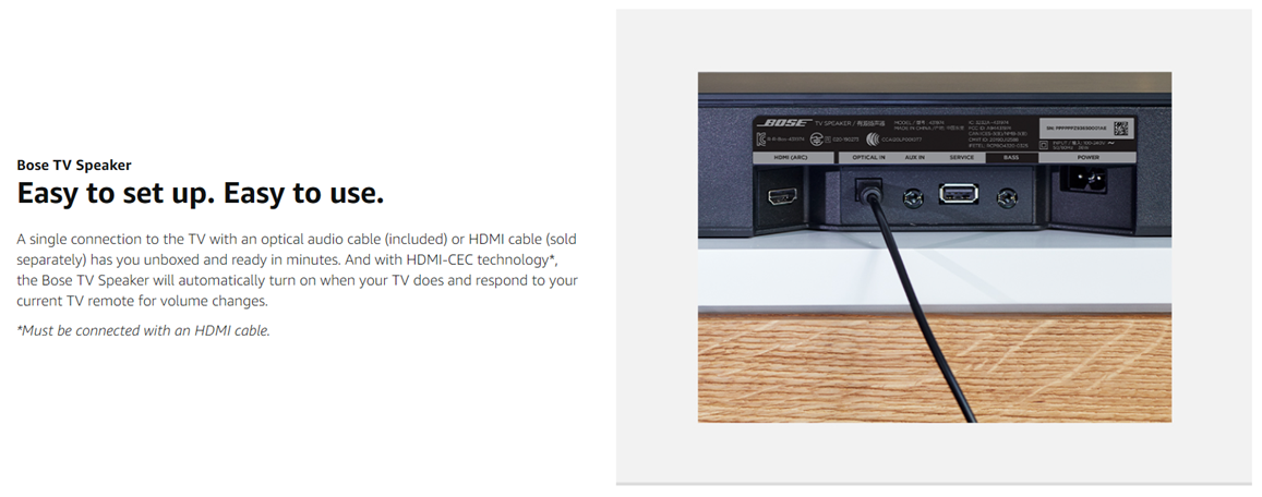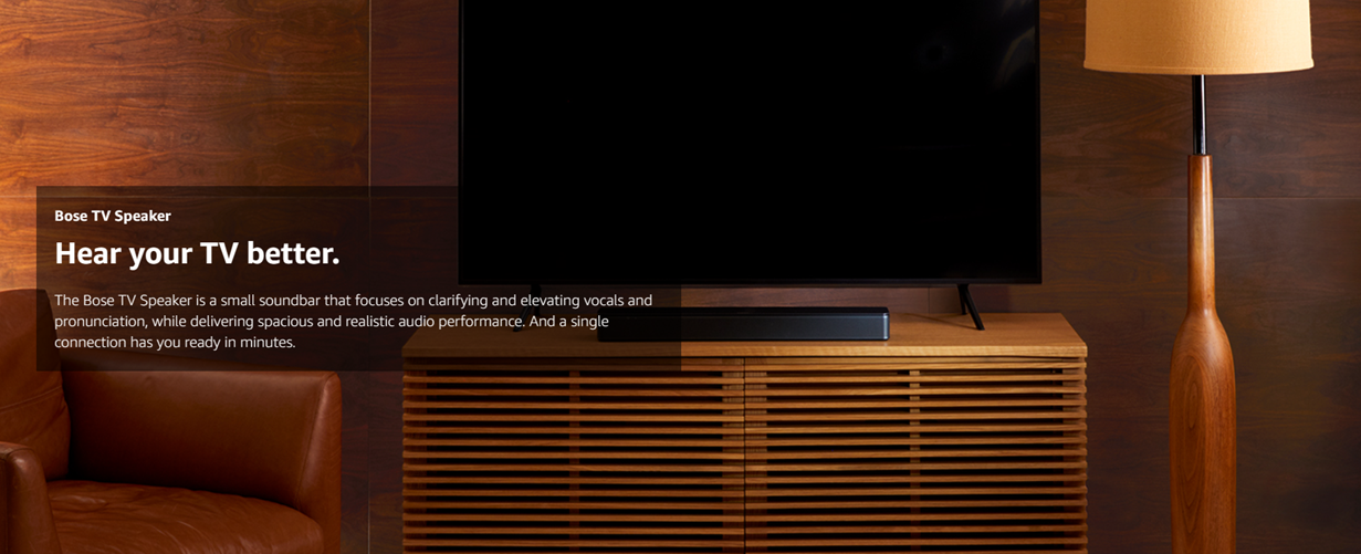 The Bose TV Speaker helps you hear your TV better. It’s a small sound bar that clarifies speech and improves overall TV sound. Inside the TV speaker there are two full-range drivers angled to deliver wide, spacious sound and a center tweeter specifically focused on elevating vocals. Built-in Dolby decoding helps further enhance this compact TV speaker’s audio capabilities to deliver a more realistic and satisfying listening experience. Designed with simplicity in mind, this small soundbar only uses a single connection to the TV via an optical audio cable (included) or an HDMI cable (sold separately) and has you up and running in minutes. At just over 2" tall, the Bose TV Speaker is a compact sound bar that can be placed just about anywhere. And small LED lights on the front of this small soundbar turn on and/or change color for visual confirmation when certain features are enabled. They also blink in acknowledgement of volume changes. The Bose TV Speaker has HDMI-CEC, which allows the TV and this small soundbar to communicate when connected with an HDMI cable. Meaning when you turn the TV on, the TV speaker will automatically turn on too. With this technology, you can even keep using your current TV remote to control the volume of this compact soundbar. However, the Bose TV Speaker comes with its own remote. And on it, you can enable “dialogue mode” on the TV speaker to elevate vocals even more or press the “bass” button for some extra depth. This compact soundbar also is a Bluetooth soundbar. Simply press the Bluetooth button on the remote to pair your device to this Bluetooth TV speaker and wirelessly stream your favorite music or podcasts. You can also expand your system at any time by adding a wired subwoofer to the Bluetooth TV speaker for a more home-theater-like experience. The Bose TV Speaker is compatible with the Bose Bass Module 500 and 700 and requires the Bose Bass Module Connection Cable or a standard 3.5 mm audio cable, sold separately.