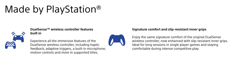 Get an edge in gameplay by creating your own custom controls to fit your playstyle. Built with high performance and personalization in mind, the DualSense Edge™ wireless controller invites you to craft your own unique gaming experience so you can play your way. Ultra-Customizable Controls: Changeable stick caps, remappable inputs and custom settings make your DualSense Edge™ wireless controller uniquely yours. Fine tune your aim by adjusting stick sensitivity and dead zones, set the travel distance of your triggers for faster inputs, and quickly swap between control profiles so you’re always ready for your next game. Mappable Back Buttons: Swappable back buttons can be configured to any other button input, so you’ve always got game-changing actions and essential controls at your fingertips. Plus, with two different styles of button to choose from, you can pick an input type that feels just right for your playstyle. DualSense™ Wireless Controller Features Built In: Enjoy all the immersive features of the DualSense™ wireless controller and our signature controller comfort. Experience varying force and tension at your fingertips with adaptive triggers and feel your in-game actions and environment simulated through haptic feedback. Replaceable Stick Modules: Play for longer with swappable replacement stick modules available to purchase separately. Haptic feedback and adaptive trigger features available when supported by game.