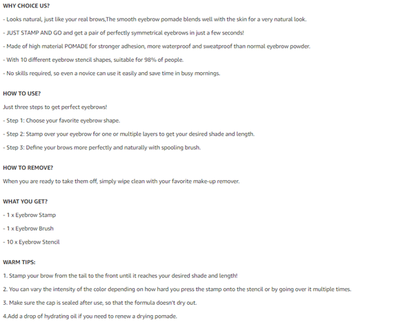 【PERFECT GIFT CHOICE】This eyebrow stamp set is a great gift for lovers, friends, and family. Your girlfriend/wife must be very pleased to receive this gift. Package include: 1 x eyebrow stamp, 1 x eyebrow brush, 10 x eyebrow stencil.