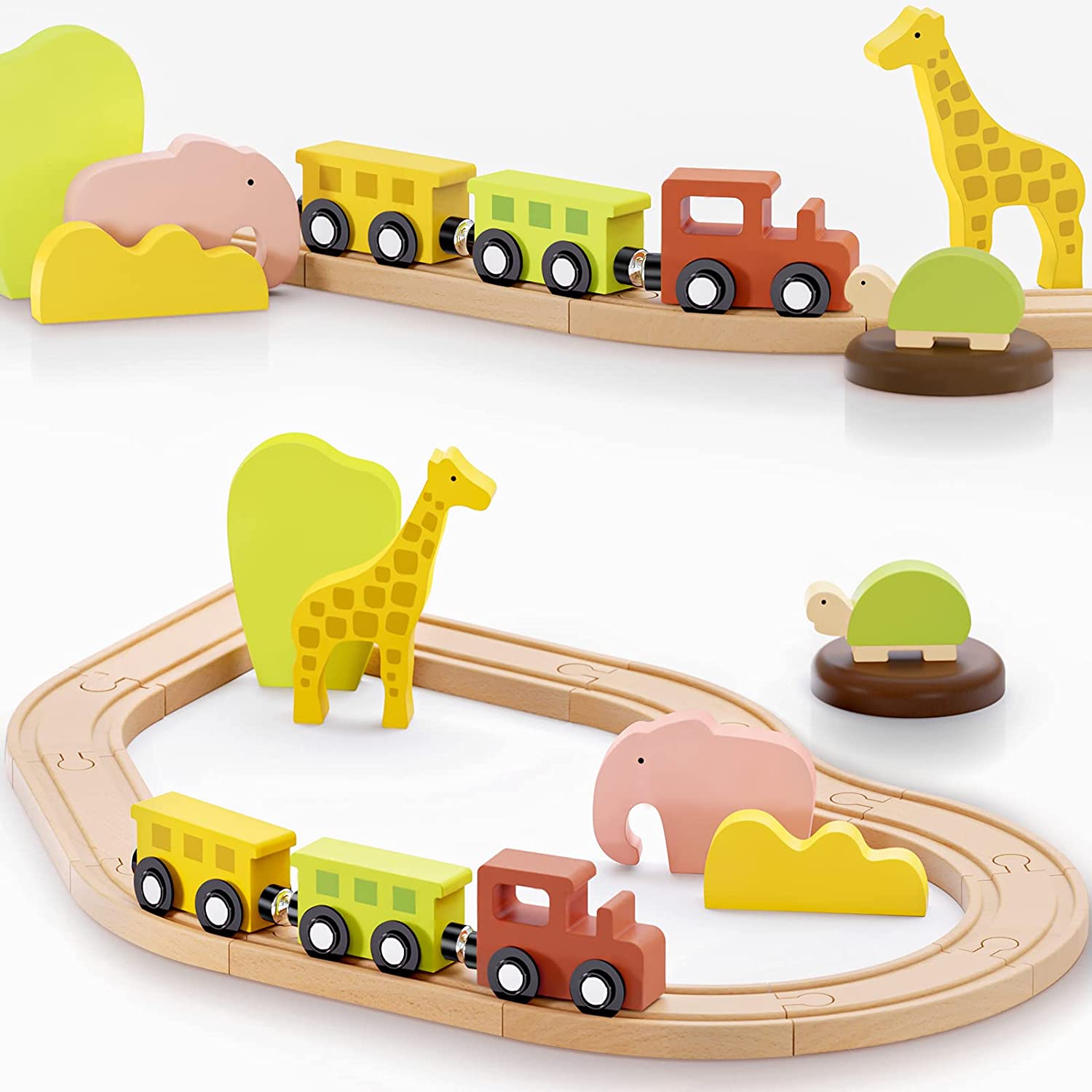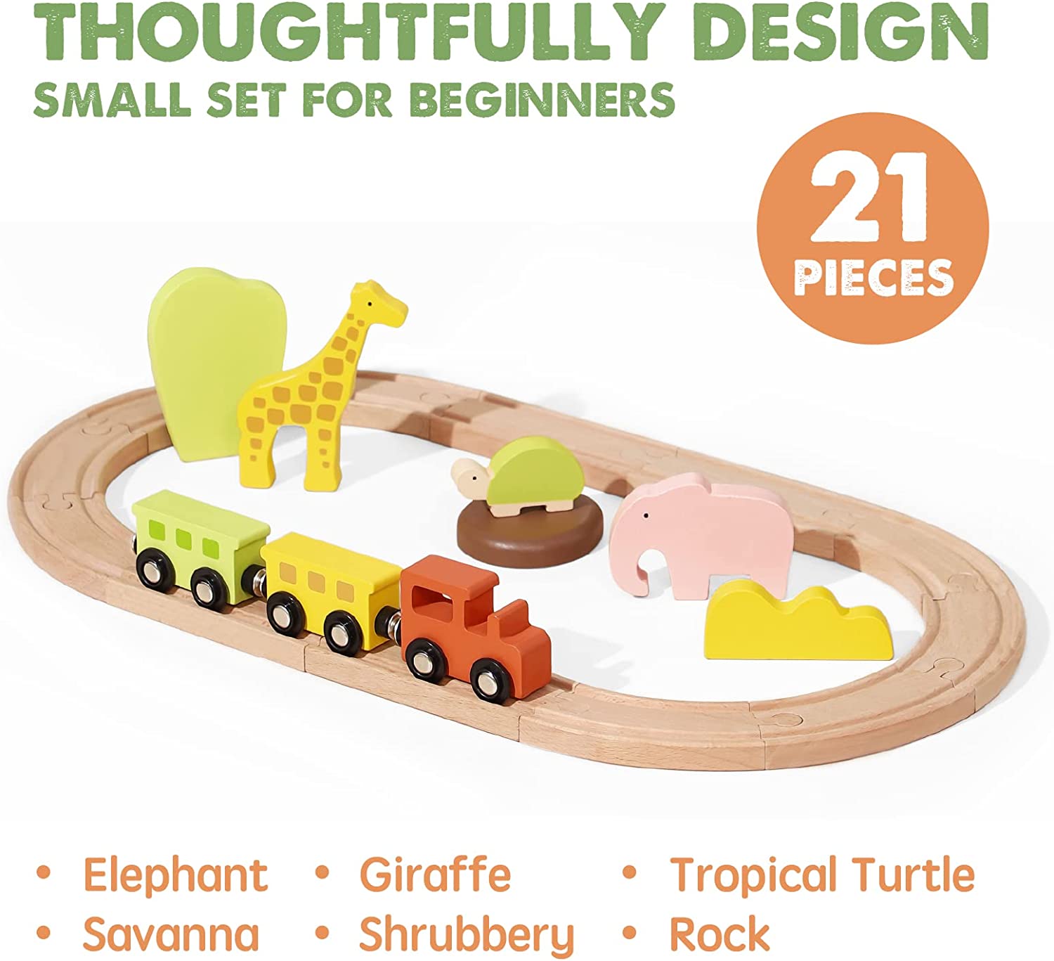 ?Safari Theme Wooden Train Set: Driving your first train and having a wonderful visit to the zoo! Toddlers aged 1-3 can explore different shapes of animals by "traveling" in the zoo. The rhythmic click-clack sound of the toddler toys on the wooden train track leads babies into the world of imagination.