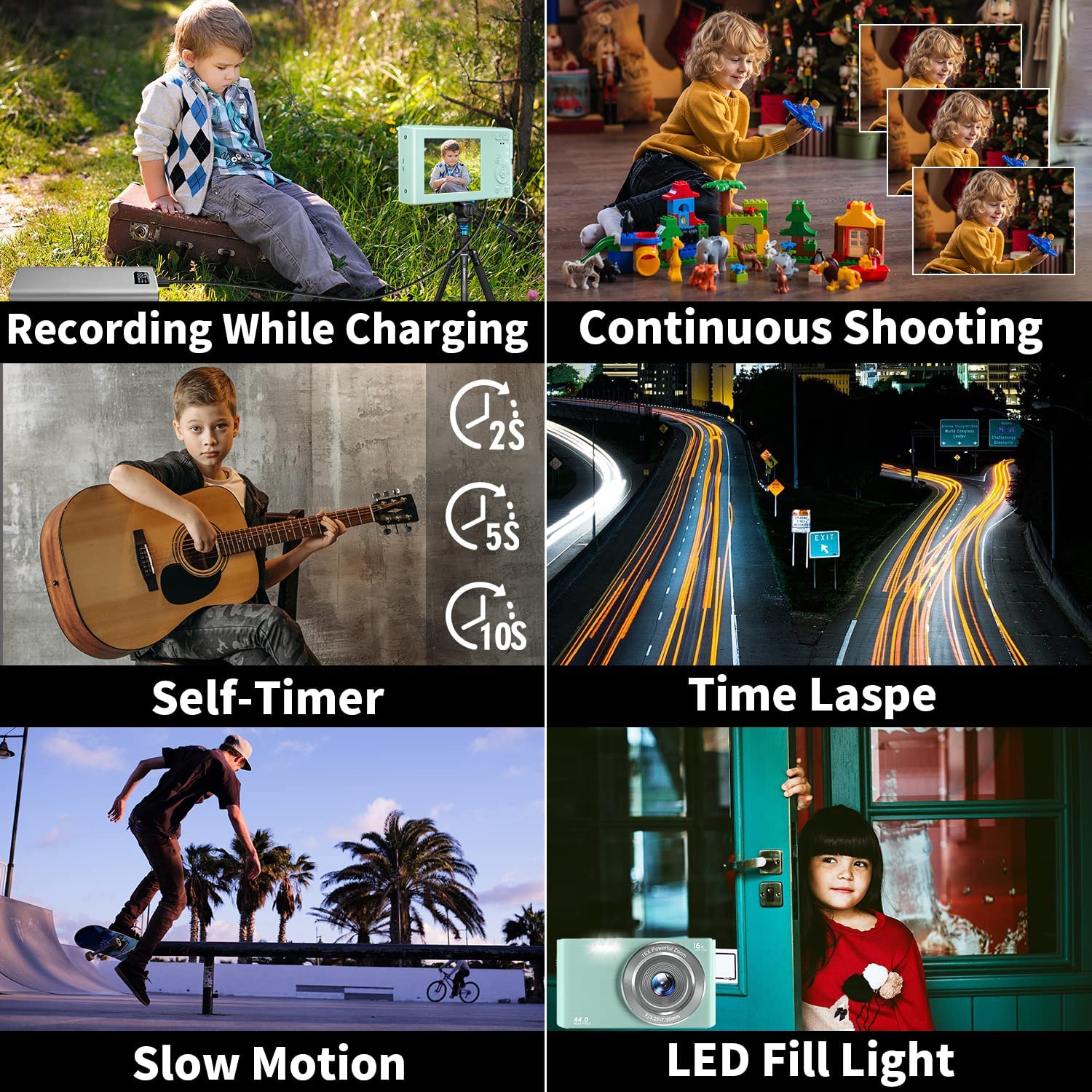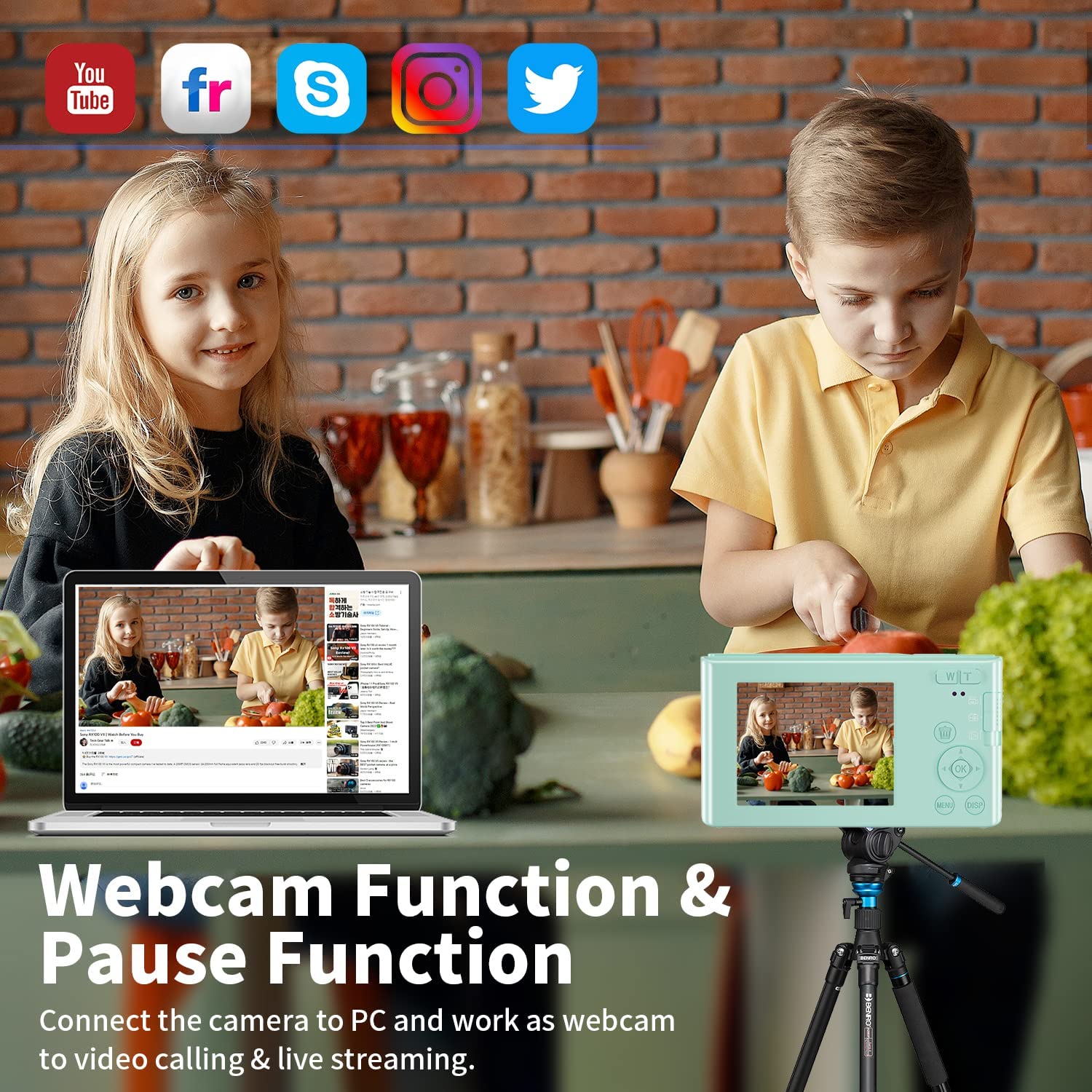 - 【16X Digital Zoom & 2.4" IPS Screen Video Camera】 Kids camera supports 16x digital zoom, You can zoom in or zoom out the subject by pressing the W/T button while recording video and taking still images. The youtube camera for kids girls boys adults also has a pause function, you can press the "OK button" to pause when recording or playing a video. Designed with 2.4"IPS screen, and it's also a good protection for kids' eyes.