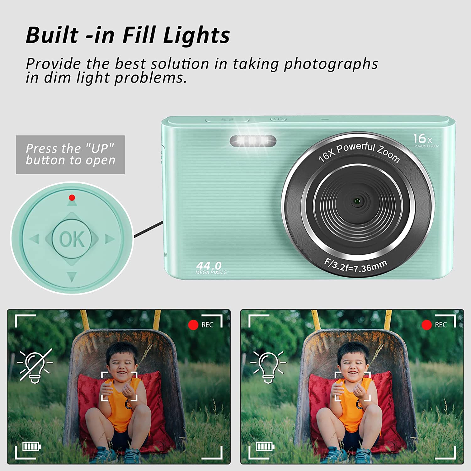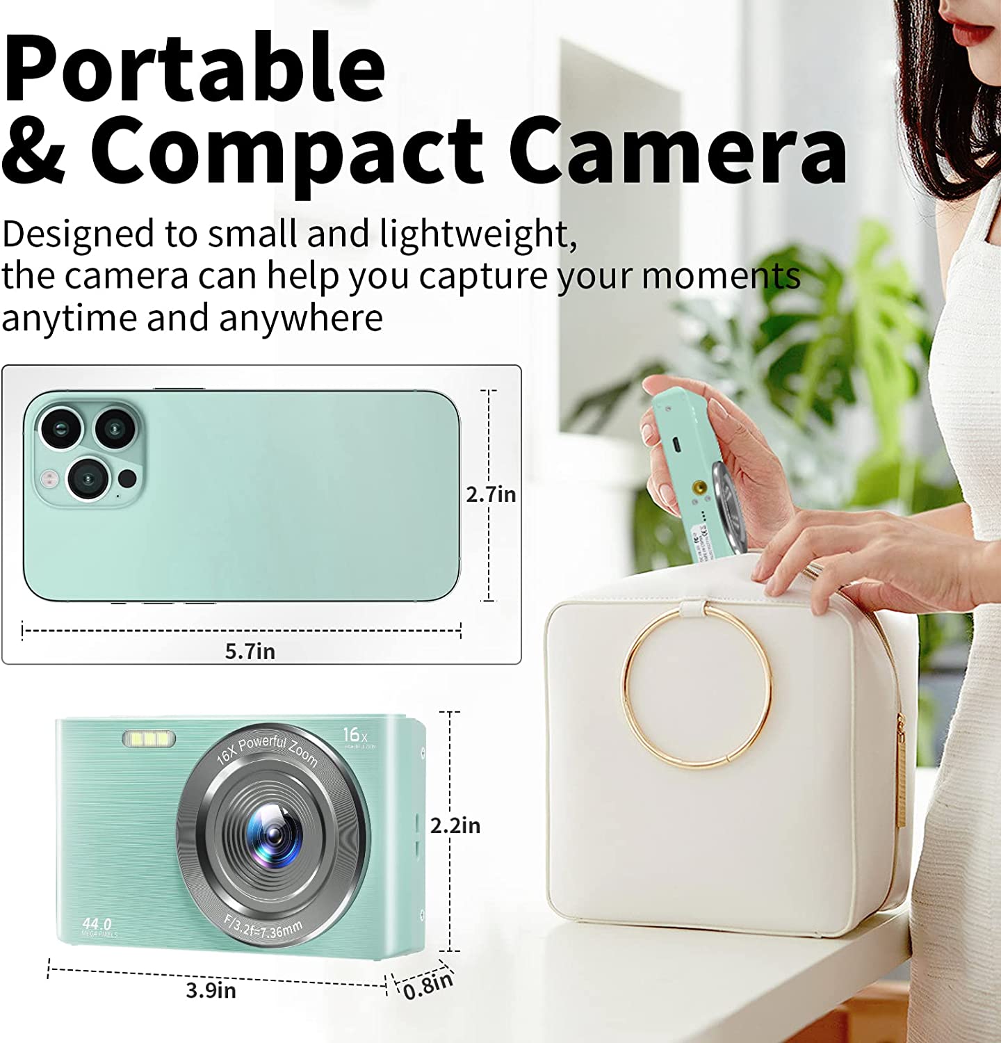 - 【4K & 44MP Digital Camera】4K mini camera for kids girls boys adults has 4k video resolution and 44MP image resolution, and support 16X digital zoom, helping you capture and record the most exciting memorable moments with high-quality images or videos.