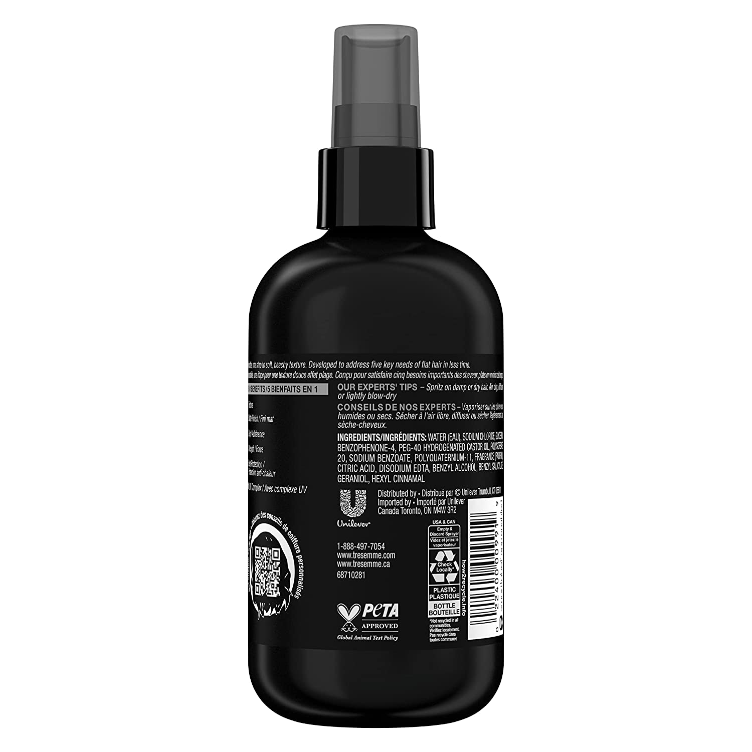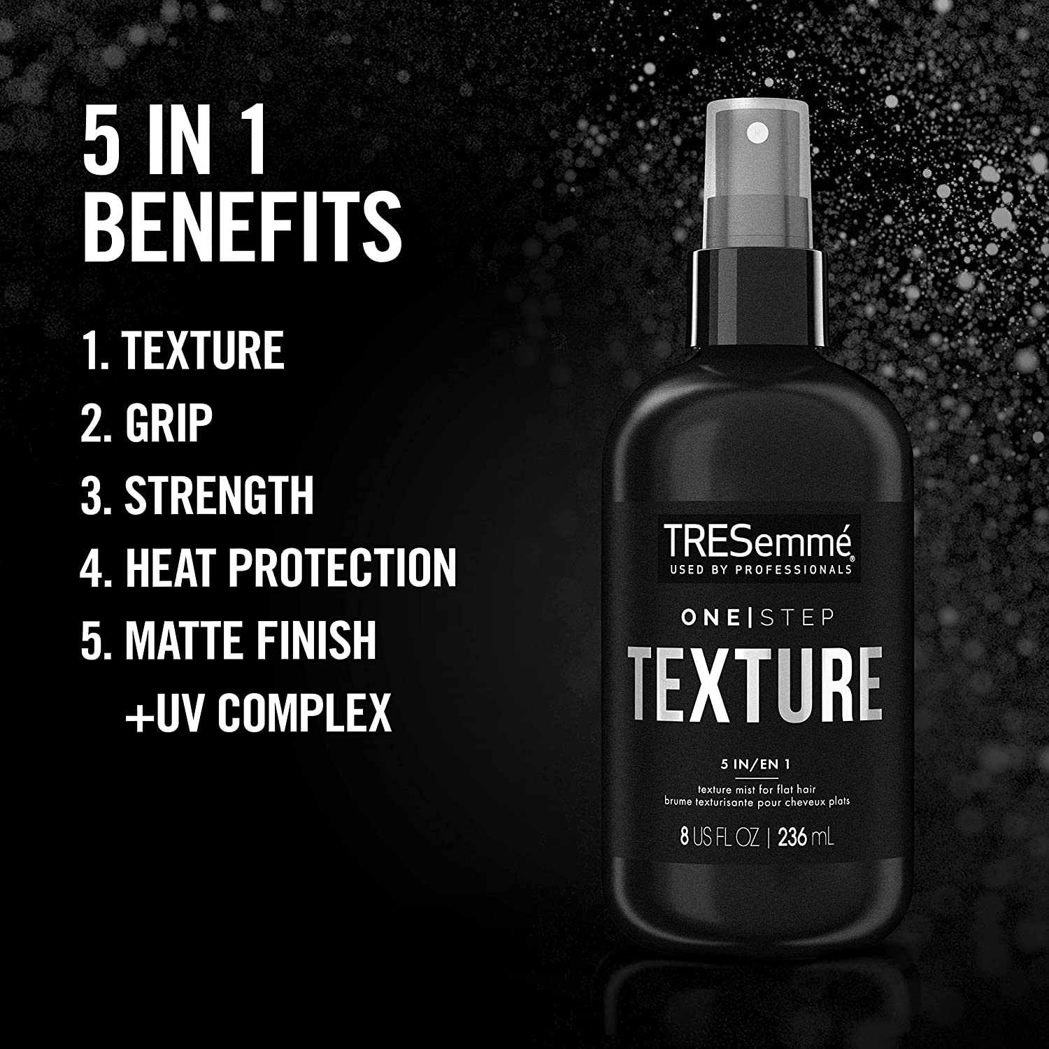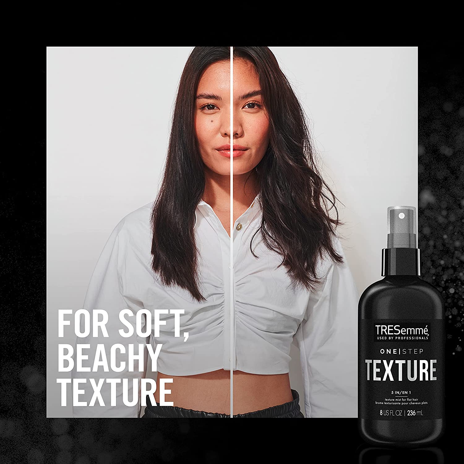 How to attain your hair goals in ONE SIMPLE STEP? With so many hair products on the market, TRESemmé One Step 5-in-1 Texture Mist makes your styling routine easier by providing 5 benefits in one step! TRESemmé One Step 5-in-1 Texture Mist is a salon-quality hair mist that will produce grip and texture with a matte finish. This salt-based hair texture spray contains glycerin, so your hair doesn't feel dried out. Our multitasking hair mist helps add texture, grip, strength, and head protection with a matte finish. This texture styling spray provides a light, flexible hold that will keep your locks in place. How to use this hair care product: Spritz this leave in hair treatment onto damp or dry hair. Air dry, diffuse or lightly blow-dry. We've always understood that style is more than a look: it's a part of you. With our professional quality care, a world of style possibilities is yours to achieve. Every choice we make at TRESemmé, from the values we promote-such as not testing on animals and being PETA-approved-to the stylists we work with, down to the carefully selected ingredients we use, are made with intention and inspired by the latest trends and style. Because 70 years on, we believe in the power of style. So tell your story, land that job, make your mark – and achieve your aspirations with confidence. With TRESemmé, your style can match your ambition.