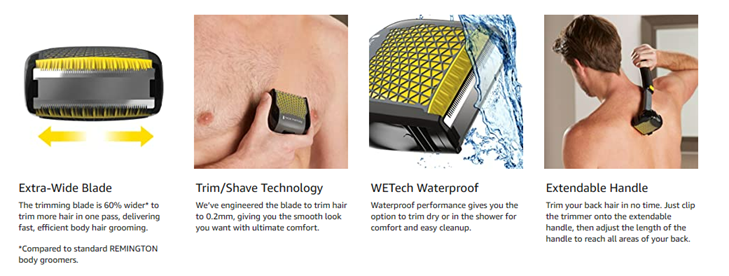 Get ultra fast results for your body grooming routine with the REMINGTON ShortCut Pro Body Groomer with Handle. The stainless steel blade is 60% wider to trim more body hair with each pass, and it's dual-sided so you can trim in either direction. It's finally easy to trim your back hair! Just clip the trimmer onto the extendable handle and use the different length settings to reach all areas of your back. Our innovative Trim/Shave Technology cuts hair as close as 0.2mm for smooth, comfortable performance. And you can attach a guide comb to find the length you want (2-12mm). WETech 100% Waterpoof gives you the freedom to trim up in the shower for ultimate comfort, and the washout port makes it simple to keep your trimmer fresh. It's powered by a Lithium rechargeable battery with 40 minutes of cordless runtime with every full charge. It all adds up to efficient and comfortable body hair trimming. Compared to standard REMINGTON body groomers.