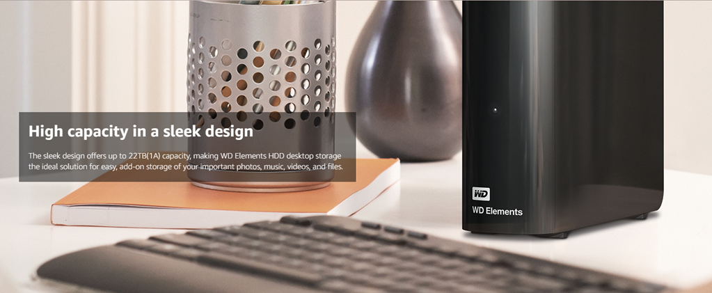 WD Elements desktop storage with USB 3.0 offers reliable, high-capacity, add-on storage, fast data transfer rates and universal connectivity with USB 3.0 and USB 2.0 devices. The sleek design features up to 18TB capacity plus WD quality and reliability. As used for storage capacity, one terabyte (TB) = one thousand GB. Total accessible capacity varies depending on operating environment.