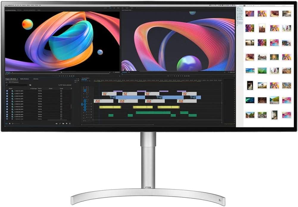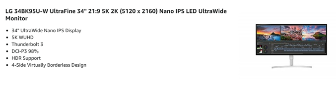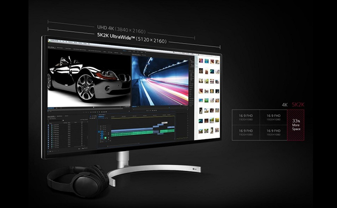 Multitaskers can now work in a generous 5:9 area while simultaneously viewing a 16:9 4K video on the same screen. The 5K2K 21:9 display of the 34WK95U offers 5120 x 2160 resolution optimized for video editors, programmers and developers, with convenient single-cable Thunderbolt 3 connectivity. Using the 178° horizontal and vertical viewing angles, it is possible to watch content from virtually any position. This display has one Thunderbolt 3 / USB Type-C port , one DisplayPort port, and two HDMI. If you'd like to take advantage of this display's USB capabilities, there is one USB Type-B port and two Type-A ports and audio can be output using the dual integrated 5W stereo speakers or 3.5mm headphone jack. It features a vertical tilt of -5 to 15° and a height adjustment of 4.3".