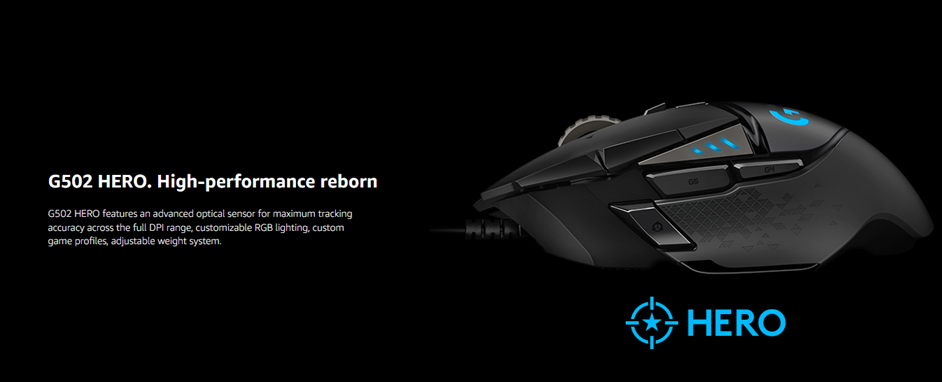 Logitech updated its iconic G502 gaming mouse to deliver even higher performance and more precise functionality than ever. Logitech G502 Hero high Performance Gaming mouse features the next generation Hero 16K Optical sensor, The highest performing and most efficient gaming sensor Logitech has ever made. An all-New lens and an updated tracking algorithm deliver ultra-precise tracking with no acceleration, smoothing, or filtering over the entire DPI range. Now, customize RGB mouse lighting to match your style and environment or sync to other Logitech G products. No matter your gaming style, It's easy to tweak G502 Hero to match your requirements, with custom profiles for your games, adjustable sensitivity from 200 up to 16, 000 DPI, and a tunable weight system that allows for tuning and balancing of up to five 3. 6G weights for just the right balance and feel.