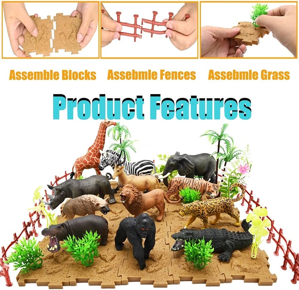- PUZZLE BLOCKS: With 25pcs puzzle blocks for imitating the soil, 12pcs trees, grass and flowers, 15pcs fence. Your kids can build his/her own zoo world by herself/ himself. The Animals lovers will love this animals playset toys very much.