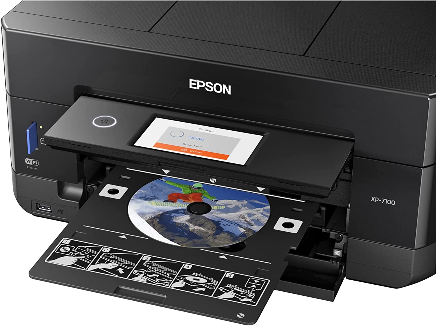 The 5 color expression Premium XP 7100 wireless Small in One printer delivers superior photo quality and versatility, ideal for productive, creative families. Save time with a 30 page auto document feeder and auto 2 sided printing, copying and scanning. Print vivid, borderless photos up to 8" X 10", or on specialty paper1 and dads. The intuitive 4. 3" Touchscreen allows you to view, edit and print photos, directly from a USB or card slot2. And, you can easily Print from your tablet or smartphone3 — with or without a router — at home or on the go. Plus, Print 4" X 6" Photos in as fast as 12 seconds5, as well as custom projects with the creative Print app This Epson printer is designed for use with only genuine Epson brand cartridges. Other brands of ink cartridges and ink supplies are not compatible and, even if described as Compatible, may not function properly or at all. Epson provides information about the design of the printer on the box and in many other locations and materials Included with the printer and on the website. Epson periodically provides firmware updates to address issues of security, performance, minor bug fixes and ensure the printer functions as designed. This printer was designed to work only with genuine Epson ink cartridges and some updates may affect the functionality of third party ink. Non epson branded or Altered Epson cartridges that functioned prior to a firmware update may not continue to function. * this product uses only genuine Epson brand cartridges. Other brands of ink cartridges and ink supplies are not compatible and, even if described as Compatible, may not function properly. Black and color print speeds are measured in accordance with ISO/IEC 24734. Actual print times will vary based on factors including system configuration, software, and page complexity. For more information- binational/Print speed 1 specialty paper support accommodated through rear paper feed, maximum 23 Mil paper thickness, manual 2 sided printing only. 2 adapter may be required. 3 Most features require an Internet connection to the printer, as well as an Internet and/or email enabled device. Wi fi Direct may require printer software. 5 color photo in draft mode on premium photo paper glossy measured from start of paper feed. Actual print times will vary based on factors including system configuration, software, and page complexity. For more information, binational/Print speed 6 smudge, scratch, water and fade resistant on Epson photo papers. For CDs/DVDs, resistant only on specially treated discs. 7 for convenient and reasonable recycling options, smart Way is an innovative partnership of the U. S. Environmental Protection Agency that reduces greenhouse gases and other air pollutants and improves fuel efficiency. This Epson printer is designed for use with only genuine Epson brand cartridges. Other brands of ink cartridges and ink supplies are not compatible and, even if described as compatible, may not function properly or at all. Epson provides information about the design of the printer on the box and in many other locations and materials included with the printer. Epson periodically provides firmware updates to address issues of security, performance, minor bug fixes and ensure the printer functions as designed. This printer was designed to work only with genuine Epson ink cartridges and some updates may affect the functionality of third party ink. Non Epson branded or altered Epson cartridges that functioned prior to a firmware update may not continue to function. Rated Voltage - 100 – 120 VAC.
