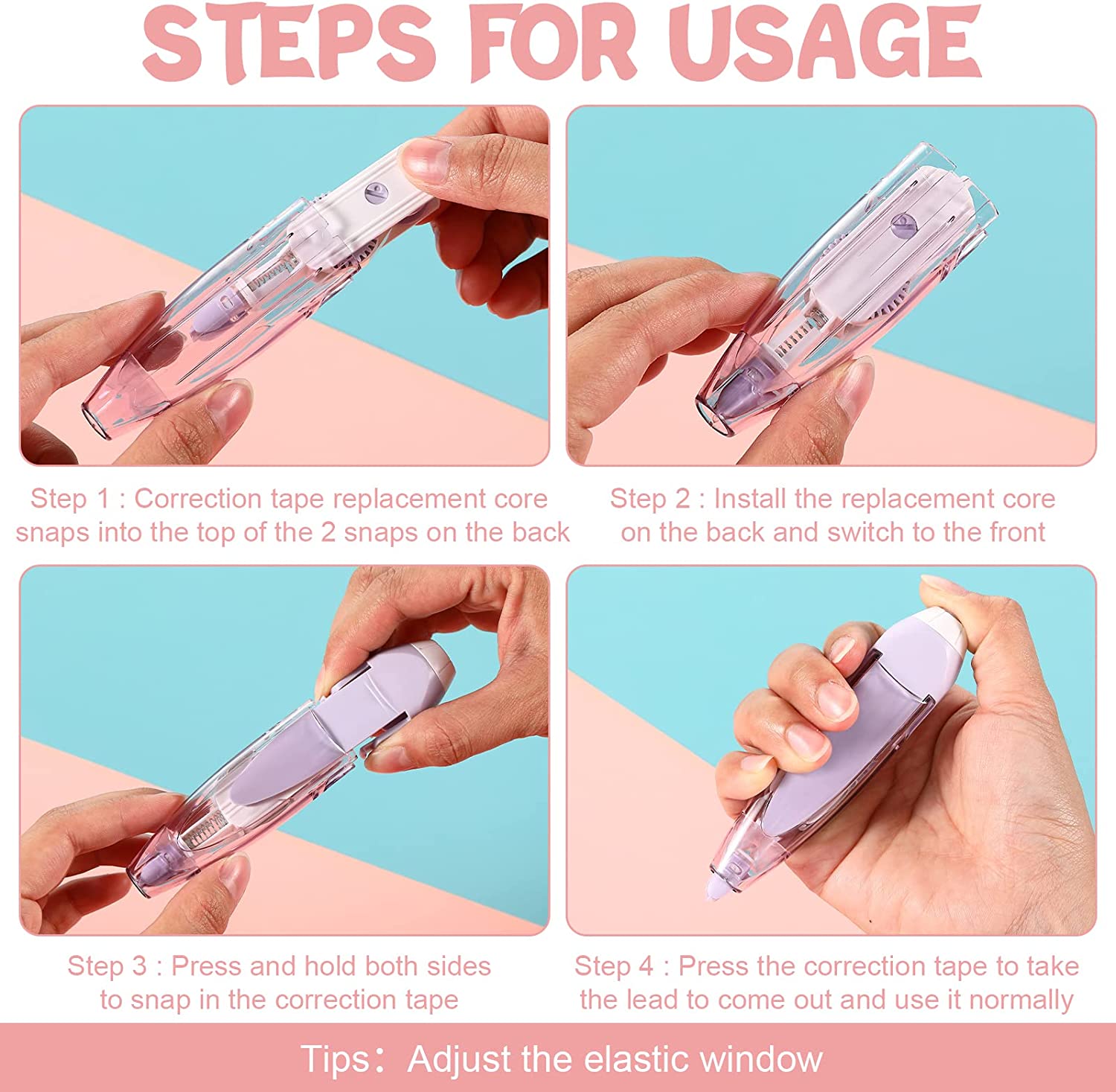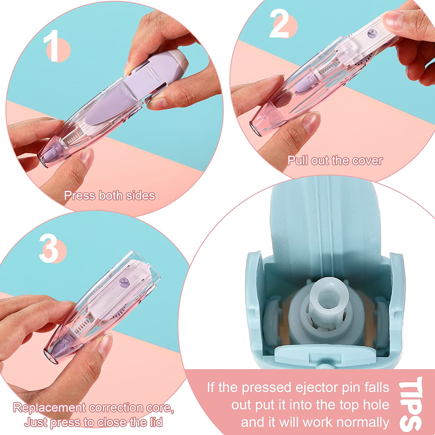 • Retractable and Flexible: the correction tape pen is designed with retractable function, easy to use and keeps pencil case clean; With replacement tapes, easy to replace, press the both sides to remove the cover, take out the replacement tape, install it back and put on the cover