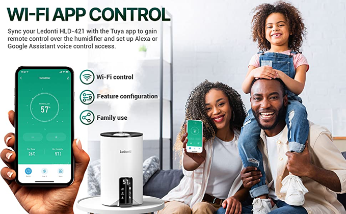 Wi-Fi control - Connect your vaporizer for bedroom with your Wi-Fi network to use all the perks of a smart device. Download the Tuya app, hit the Wi-Fi button on the display of the humidifier, connect to the network, and that’s it! A few more settings and you now control your humidifier both remotely and with your voice.
