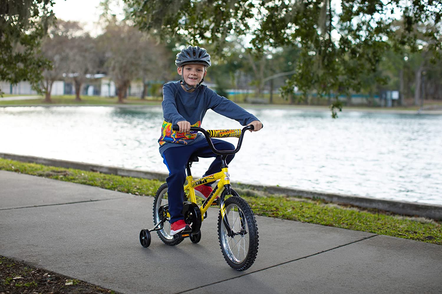 Be awesome, be epic, and cause some major damage! You’re sure to accomplish all three when you ride the Magna Major Damage 12-inch Boys Bike by Dynacraft. This BMX-style frame features a bright blue and black deluxe paint finish, along with eye-catching custom graphics and colorful details on the handlebar pad, frame, and chain guard. Coaster brakes make stopping especially easy and removable/adjustable training wheels provide an extra level of stability until they’re ready to cruise on their own. An adjustable, padded seat also allows the bike to grow with them. The size and design of the bike are great for riders ages 3-5 years. Give your young one an epic ride on the Dynacraft Major Damage 12-inch Boys Bike.