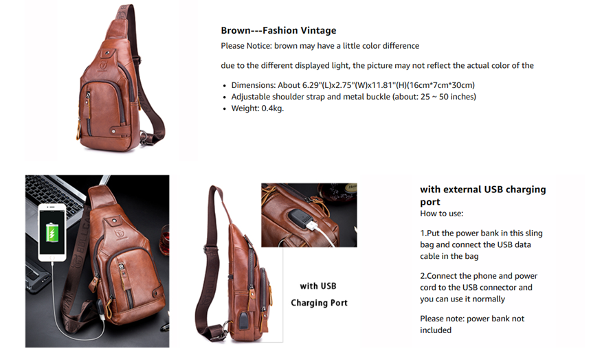 Excellent Design: with external USB charging port (power bank not included), with hole for earphone wire. this men casual crossbody daypacks has two stainless steel drings on the back. you can choose the left or right side according to your usage habits. you can wear it like a chest bag/shoulder bag/shoulder bag. It's safe, stylish, convenient, lightweight and comfortable.