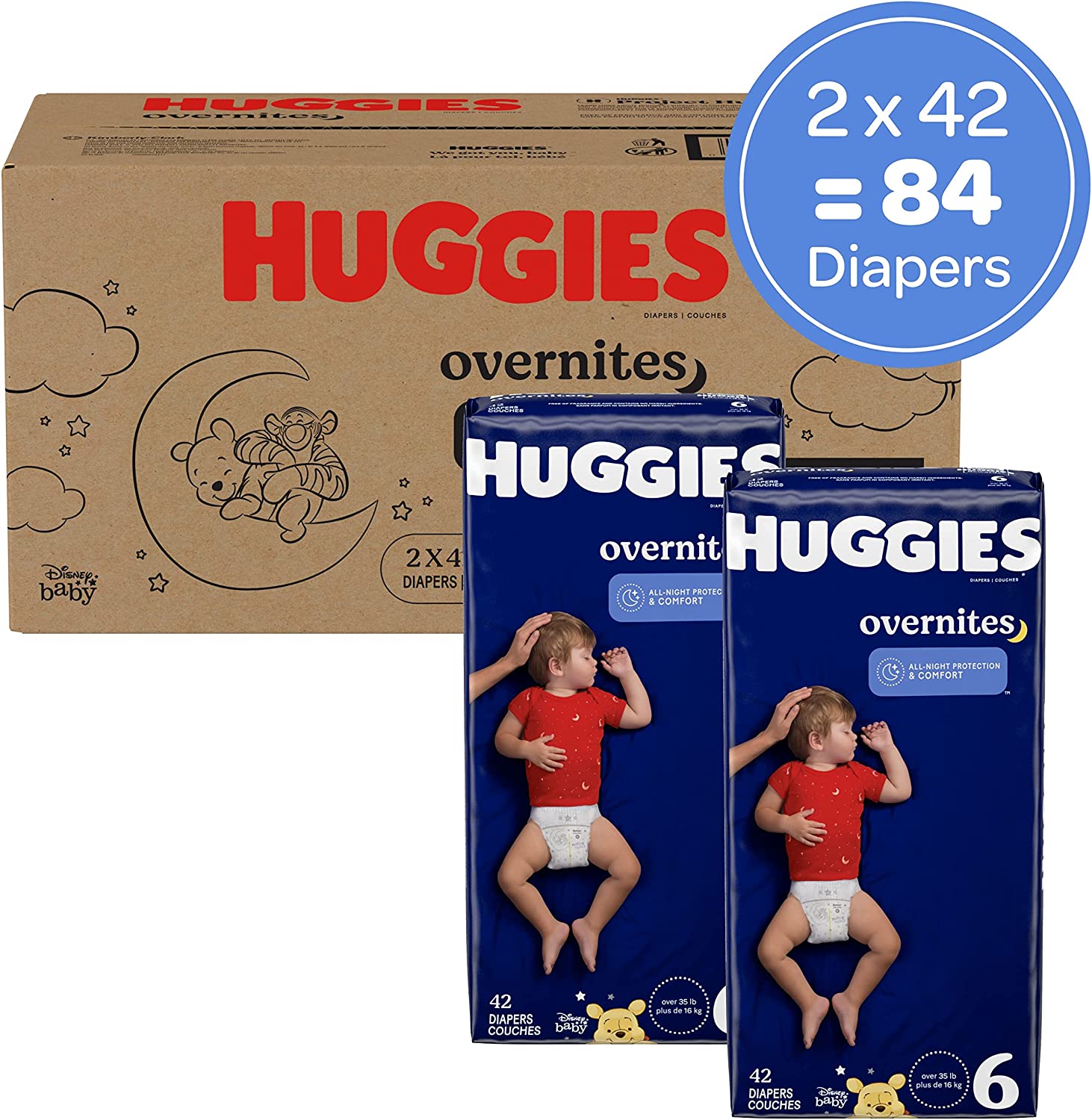 Dry nights and happy mornings are possible for your baby with Huggies Overnites Nighttime Baby Diapers. As the #1 Best Selling Night-Time Diaper*, Huggies Overnites offers all-night protection and comfort with a contoured shape and extra softness around the legs. Overnites are Huggies' most absorbent diaper and are made with a DryTouch Liner with extra absorbency that locks away moisture for up to 12 hours of overnight protection, keeping your baby's skin dry as they sleep. Each overnight baby diaper also features Huggies' SnugFit Waistband and Double Grip Strips for a more secure fit, especially for babies starting to toss and roll in their sleep. They also come with a pocketed waistband to help prevent blowouts. These disposable baby diapers have a wetness indicator to let you know when it's time for a diaper change, and a breathable outer cover to keep your baby's sensitive skin dry and comfortable. Huggies Overnites feature adorable Disney Winnie the Pooh designs and are available in size 3 (16-28 lbs), size 4 (22-37 lbs), size 5 (27+ lbs) and size 6 (35+ lbs). For ultimate daytime protection, try Huggies Little Movers! Join the new Huggies Rewards+ powered by Fetch to get rewarded. Earn points on Huggies diapers and wipes, in addition to thousands of other products to redeem for hundreds of gift cards. Download the Fetch Rewards app to get started today! (*Based on US Nielsen data ending 2/5/2022)