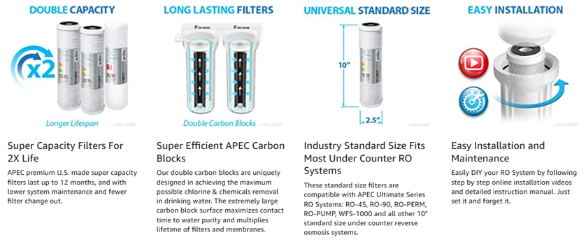 APEC Ultimate high capacity pre-filter set is made in USA with high quality filtration components to provide a longer lasting filter set to protect and prolong the lifespan of your reverse osmosis system. Premium quality filter set lasts over 12 months for fewer filter change outs and high performance contaminant removal. These standard size filters are 10" and compatible with all standard size under counter RO systems. 1st Stage: High-Grade 10" high-capacity polypropylene sediment filter -removes dust, particles, and rust. 100% pure polypropylene depth filter with exceptional dirt-holding capacity translates to longer life and fewer change-outs than existing string-wound or resin-bonded filters. 2nd and 3rd Stage: Premium Extruded Carbon Block 10" -gets rid of unpleasant chlorine, tastes, odors, cloudiness and colors. Also removes VOCs and other common chemicals from the water. APEC's extruded carbon block filters consist of activated carbon particles fused into a uniform block with enhanced adsorptive capacity and efficiency. Unlike granular activated carbon (GAC) filters, these extruded carbon block cartridges will not channel or bypass due to the extreme uniformity of their extruded activated carbon core. Compatible for APEC RO-45, RO-90, RO-PERM, RO-PUMP and all other standard size under counter reverse osmosis systems. About APEC For over 17 years, APEC has been an industry leading manufacturer who specializes in high performance RO systems. As the original manufacturer, we have dedicated a knowledgeable and sincere team that is committed to providing customer satisfaction in hopes to bring many years of enjoyment and good health for you and your family.