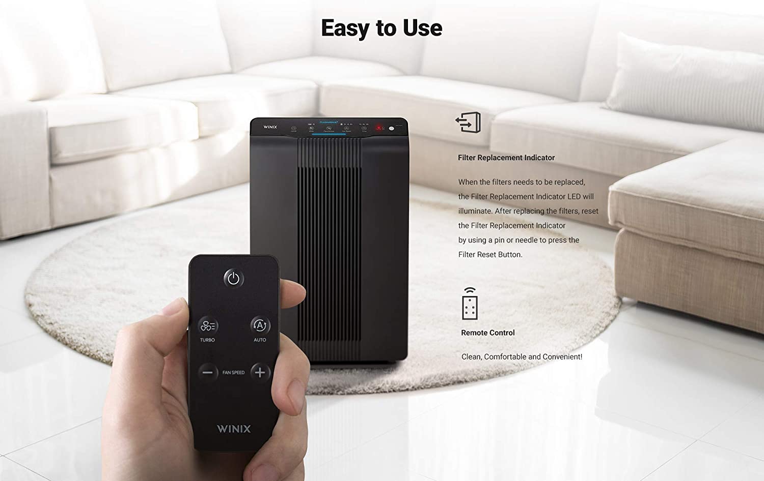 Winix 5500-2 Air Cleaner with PlasmaWave Technology. The Winix 5500-2 Air Cleaner replaces the wildly popular 5500 model. It is designed for any home environment and ready to capture dust, pollen, pet dander, smoke, mold spores, volatile organic compounds, and household odors. This unit is best used for medium to large living spaces, kitchens, or bedrooms. The WINIX 5500-2 uses a 3-Stage Air Cleaning System, featuring a Washable AOCTM Carbon Filter, 99. 97% True HEPA Filter, and Winix PlasmaWave Technology. True HEPA filter captures of airborne pollutants and allergens, while carbon filter traps offensive smoke, cooking and all other household odors. PlasmaWave Technology attacks pollutants at a molecular level to neutralize viruses, bacteria, chemical vapors, odors, and gases in the air. Air Quality Sensor offers Set-and-forget convenience by automatically adjusting your air cleaner settings to meet the needs of your environment. CADR Room Size Rating: 360 square feet - Suitable for bedrooms and living rooms Materials: Abs Dimensions: 14. 9"L x 7. 8"W x 23. 6"H Weight: 17. 5 lbs