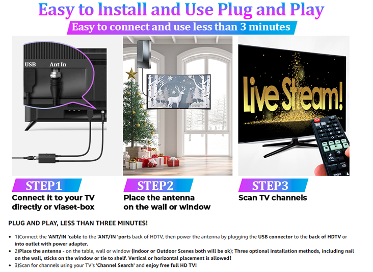 • ?▷【LIFETIME FOR FREE ALL LOCAL CHANNELS】- Say goodbye to the bill! BEYOND A PURCHASE! Enjoy hundreds of 0 COST channels with no pixelation, Brings scenes to life ! Digital HDTV Antenna start to access the news, sitcoms, kids and sports programs! TV antenna can receive channels including ABC,CBS, NBC,PBS,FOX, UNIVISION, CW, ION, UMAS ect . ❗Reminder: Re-scan channels after moving the antenna.