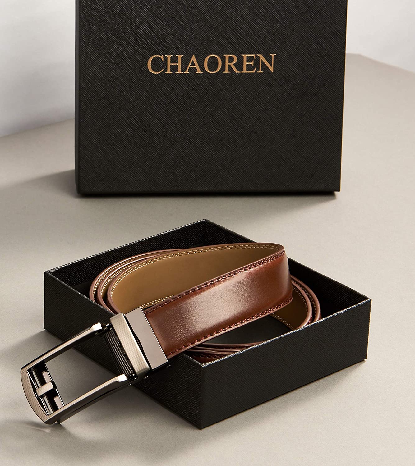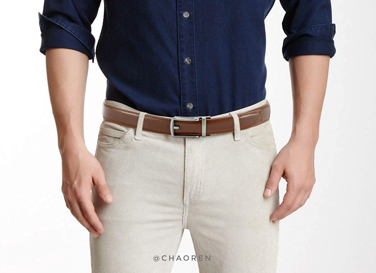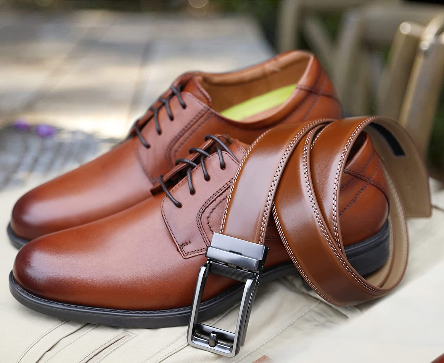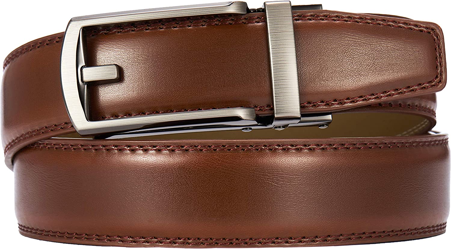 - EASY TO USE - Slide the brown dress belt for men into the sliding buckle, and the holeless belt auto-locks. Lift the automatic buckle, and pull the mens belts leather to release. Simple, smooth, and sleek!