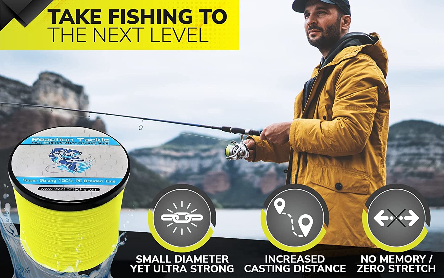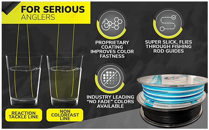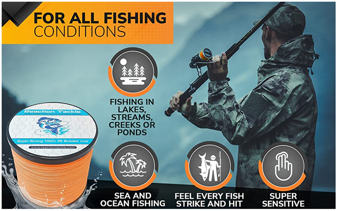 REACTION TACKLE HIGH QUALITY BRAIDED FISHING LINEReaction Tackle is located in Wisconsin. Everything is shipped from warehouses located in the USA.No need to overpay for brand name fishing line! Reaction Tackle high quality fishing braid is just as good as, if not better than, the most popular brands.Reaction Tackle 4 and 8 strand braided fishing line is made from UHMWPE, the world’s strongest fiber.We currently offer the most popular colored fishing braid such as: yellow, orange, blue, multicolor, green, camo, black, hi viz, neon, fluorescent, red, white, brown and more colors coming soon.Reaction Tackle braided line is coated for extra durability and flies through fishing guides to provide extra long casting distance. Our heavy lines can even be used for downrigger line at any depth. Braided line is a great alternative to monofilament or fluorocarbon lines use in your favorite ocean, stream river or lake.Customer satisfaction is our number one priority, give our products a chance. If you are not completely satisfied feel free to contact us and we will do whatever it takes to keep our customers happy.