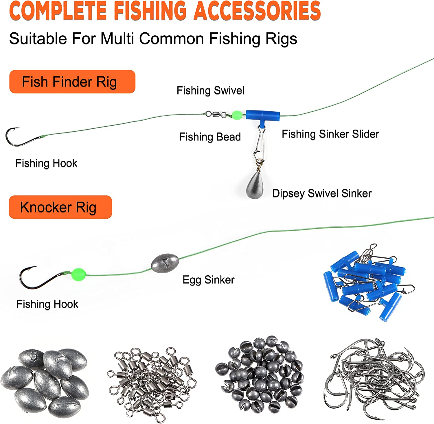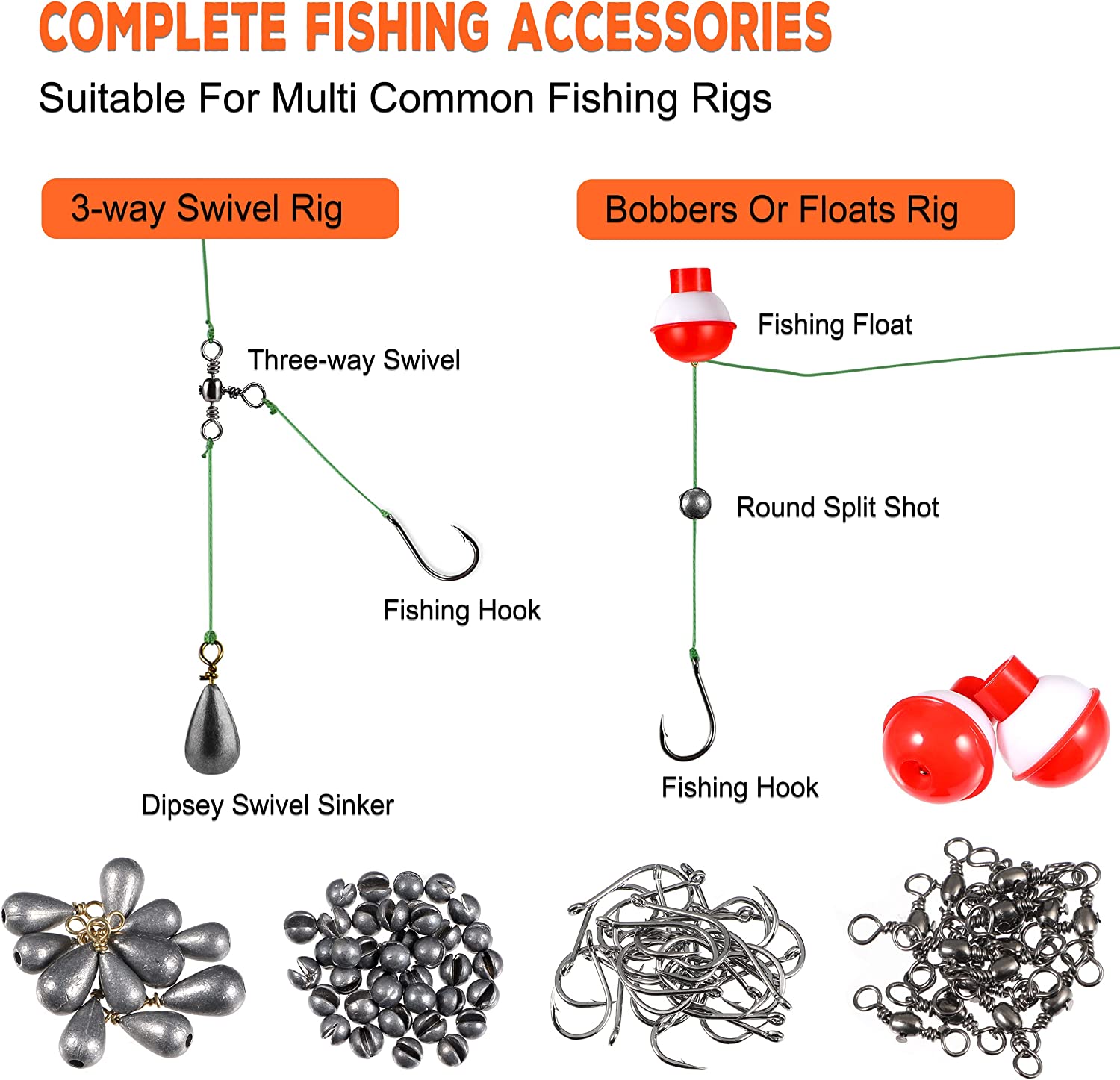 • 【Widely Usage Fishing Set】- Abundant accessories in the tackle box, to put together a variety of fishing rigs you want, such as Fish Finder Rig, Blinding Sinker Rig, and Bobbers rig. Which work great for both saltwater and freshwater, perfect for all water layers! Meet all you need for different fish you catch, such as Bass, Bluegill, Crappie, etc. This complete assortment of fishing accessories kit is suitable for any angler in any season in any water!