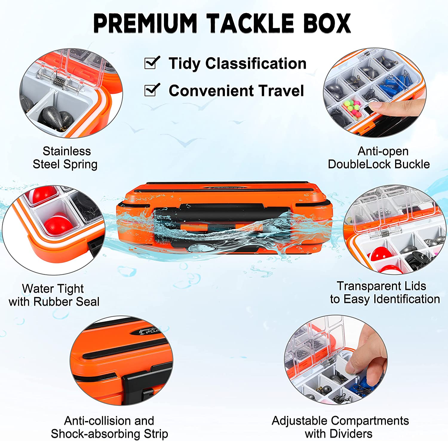 The tackle box is made of heavy-duty plastic, with an anti-collision shock-absorbing strip, and a high-strength lever-type edge lock, super sturdy and durable! Transparent lids, anti-open lock buckle, and adjustable compartments make all items well sorted storing easy identification and access!