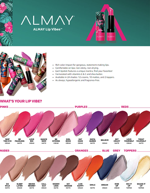 • Formulated with vitamins E and C and Shea Butter. Available in 24 shades: 12 creams, 10 mattes, and 2 toppers. As always, Hypoallergenic, Fragrance-free