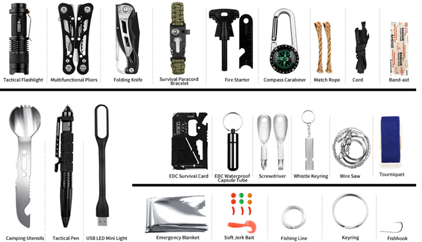 | Included Components | Whistle, Knife, Water Bottle Clip, Wire Saw, Flint, Tactical Flashlight, Hooks, Flashlight, Waterproof Box, Compass |