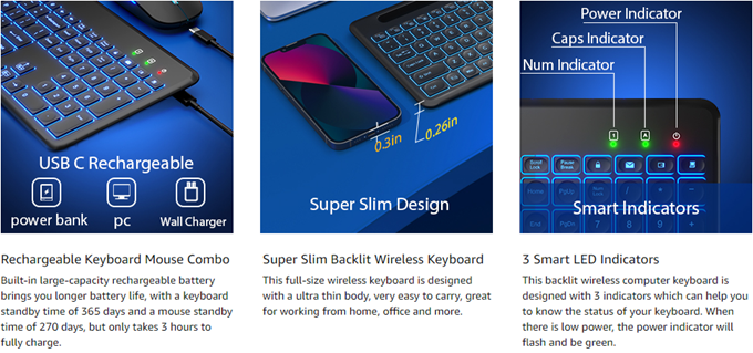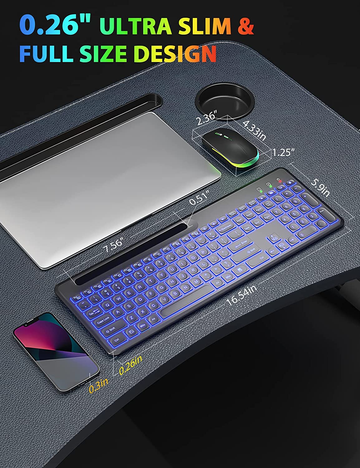 A7: This wireless keyboard and mouse combo included: 1*light up wireless keyboard, 1*light up wireless mouse, 1*USB B to C charging cable, 1*2.4GHz USB receiver, 1*USB B to C adapter, 1*User manual.