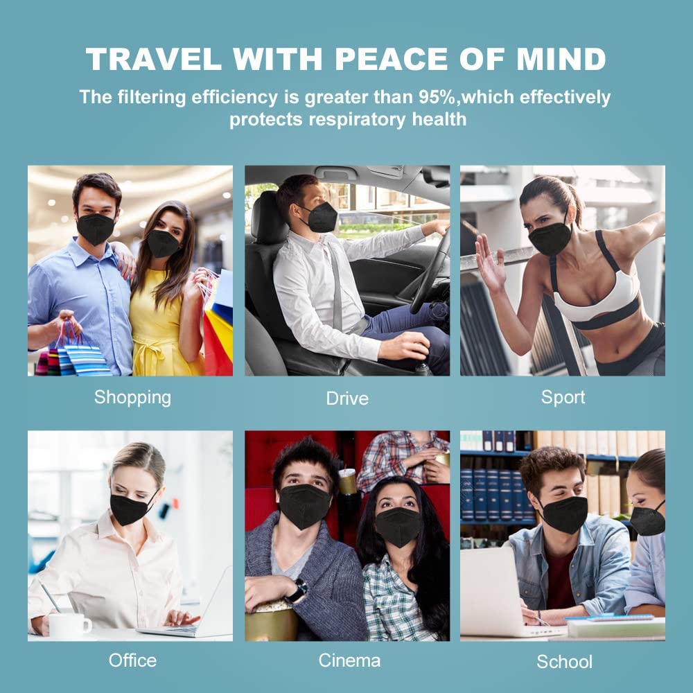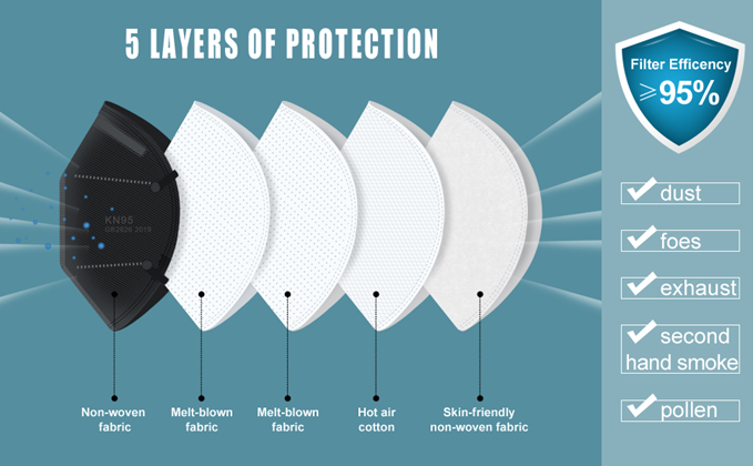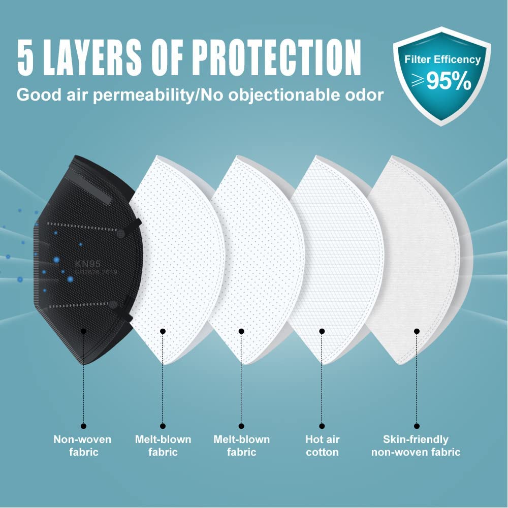 • 【Powerful 5-ply Protective Barrier】Compared to a standard disposable 3-Ply mask, the KN95 face mask of 5 layers composed of two layers of melt-blown fabric which offer over 95% filtration protection, one layer of hot air cotton capable of filtering PM2.5 particles and outer layer of non-woven cloth to block large particles while skin-friendly inner one absorb the moisture from breaths, is designed to apply more respiratory protection.