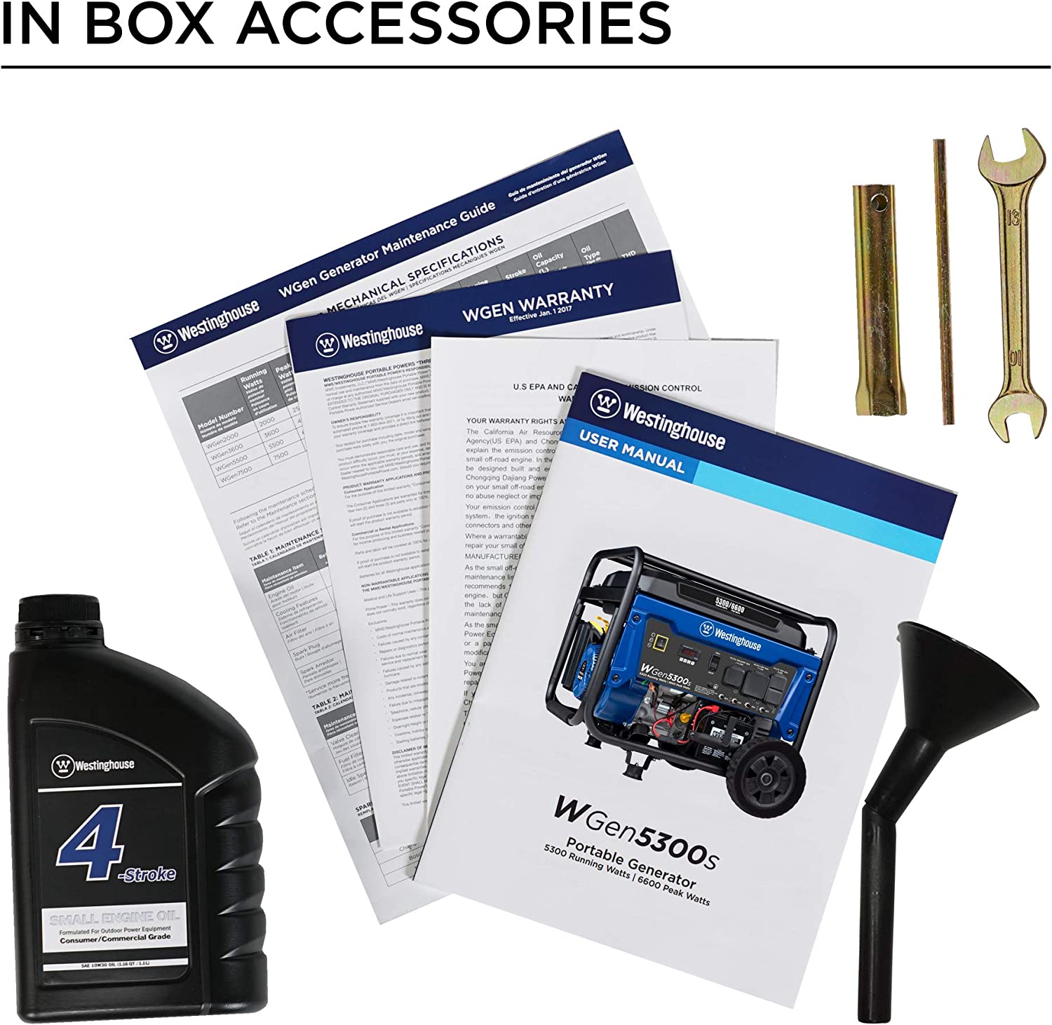 The Westinghouse WGen5300s is a versatile solution for all your power needs from your home to your RV when you’re looking for a dependable backup power supply. The WGen5300s produces 6,600 peak watts and 5,300 running watts with a powerful 274cc 4-Stroke OHV Westinghouse Engine constructed for durability. Running for up to 14.5 hours on a 4.7 gal. (18L) tank of gas, it's conveniently equipped with a built-in fuel gauge, automatic low oil shutdown, and electric start with manual choke. The L14-30R outlet is Transfer Switch Ready to supply total household power which eliminates the hassle of annoying extension cords or power strips. Combined with an RV Ready TT-30R outlet, you can ensure your recreation vehicle or home is ready to go for air conditioners, refrigerators, sump pumps, and home necessities. The intuitive control panel includes the Digital Readout to share real-time updates on maintenance information and a 120/240 Volt Selector Switch to draw more power with added flexibility for appliances like a well pump. Engineered into a compact hardened-steel frame with never-flat wheels, it's easy to bring this generator from storage to use. The WGen5300s Portable Generator is complete with a 3-Year limited service, labor, and parts coverage with Lifetime Technical Support to ensure your confidence can be backed by our nationwide customer service and support network.