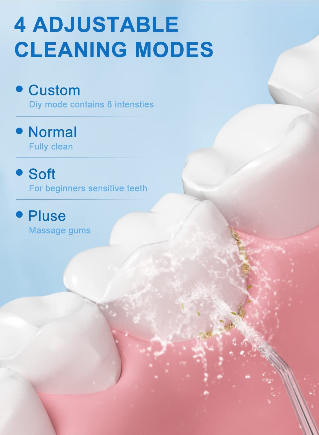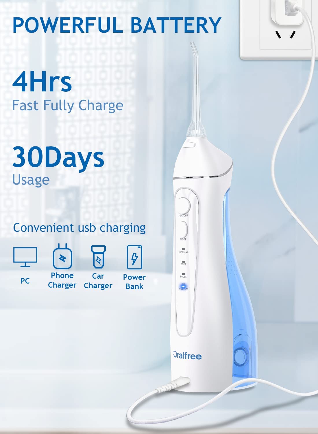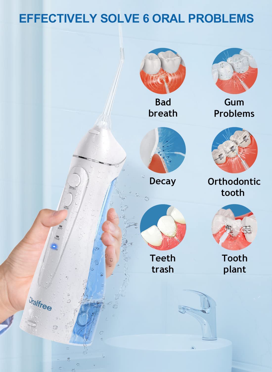 - 4 FLOSSING MODES POWER DENTAL FLOSSERS: Oralfree launch the newest portable water dental pick teeth cleaner items that was upgrade to 4 modes with Low-noise Design setting of water pressure to fulfilled your daily life use.Each mode provides you variety of using choice from standard mode, Please choose soft mode when you use dental flosser at the first time. Also helpful for bad breath, benefitful for bridge care