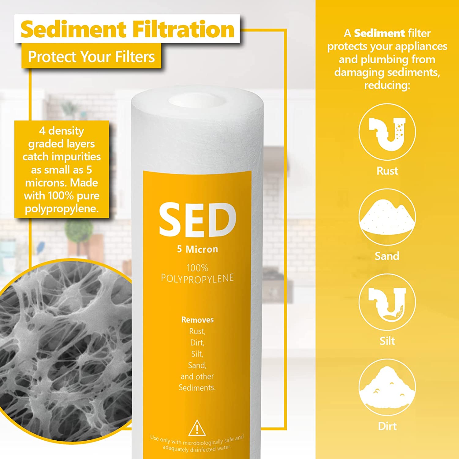 - Sediment Water Filter: Keep the most damaging sediments out of your drinking water and protect your other filters from coarse impurities including rust, sand, dirt and silt.