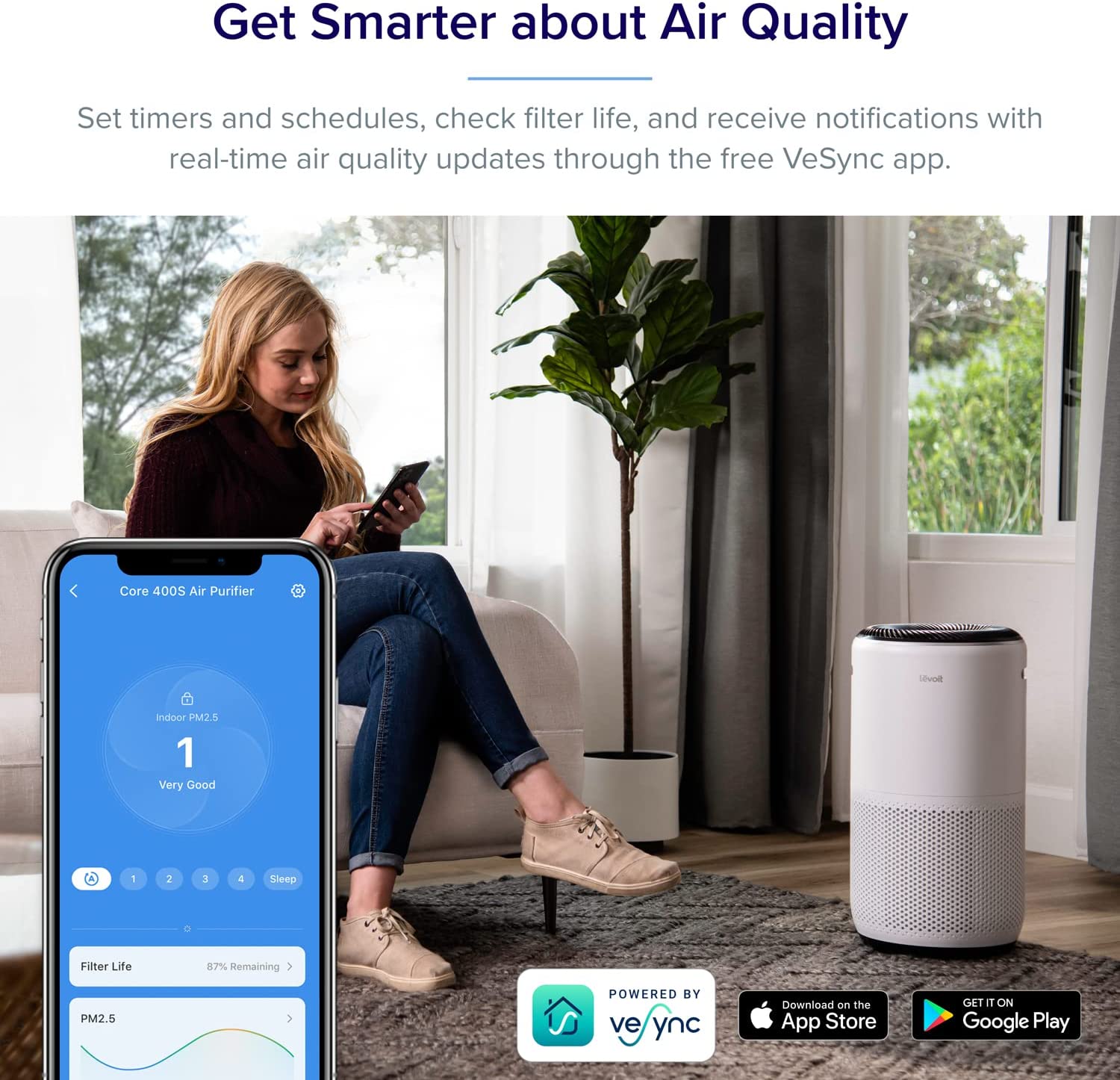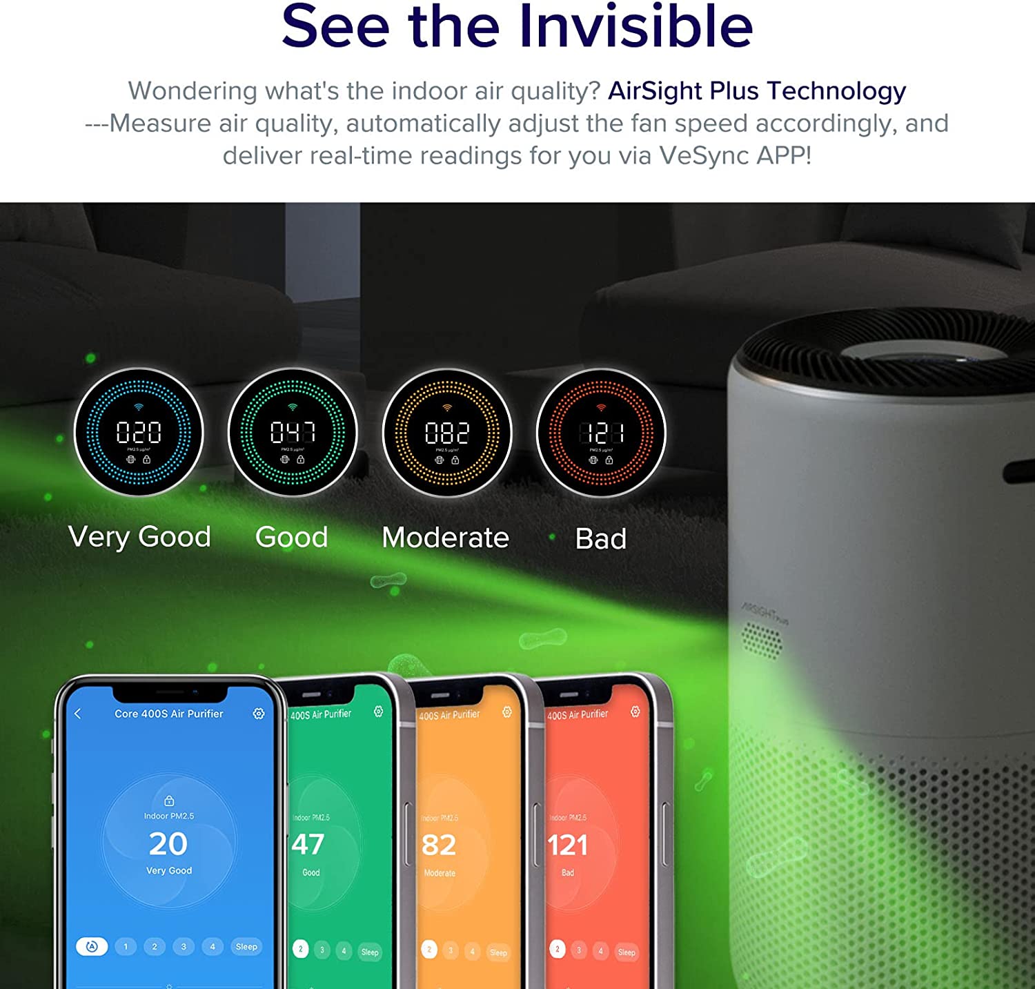 - Automatically senses and reacts to changes in air quality - then reports pollution in real time on LCD screen and on your free VeSync Link app.