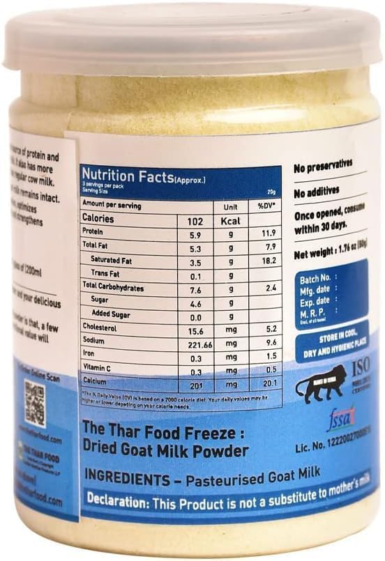 • Pure & Natural: Thar Food Goat Milk Powder is 100% pure & natural with zero additives and preservatives. It is lab tested and manufactured in ISO certified plants.